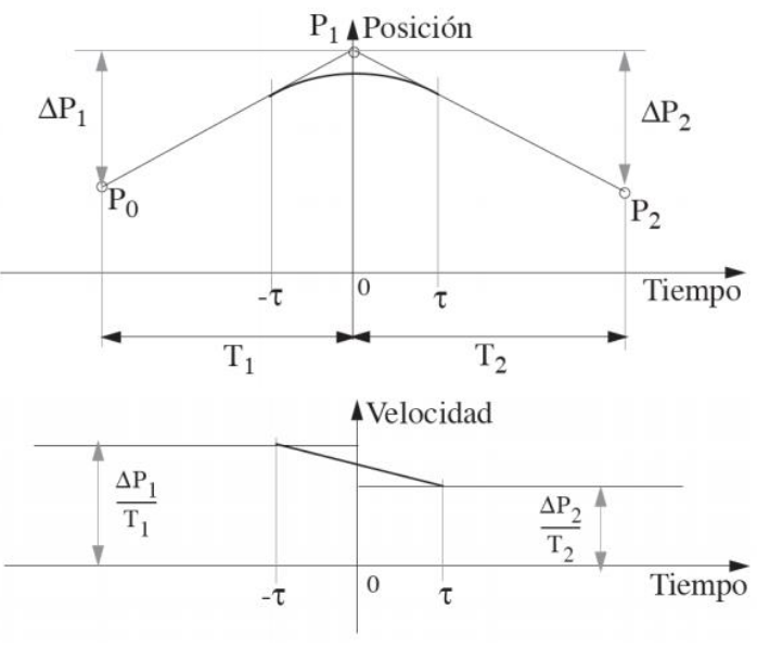 This way, \(-\tau\) units of time before reaching \(P_1\) (time 0), the velocity will be linearly changed from \(\Delta P_1/T_1\) to \(\Delta P_2/T_2\), to accommodate the velocity \(\tau\) units of time after passing \(P_1\). Thus, the problem is defined as the calculation of a quadratic function \(X(t)\) that starts at point \(P_A\) and ends at \(P_B\) (start and end points of the smoothing) defined in the time range \([-\tau, \tau]\).