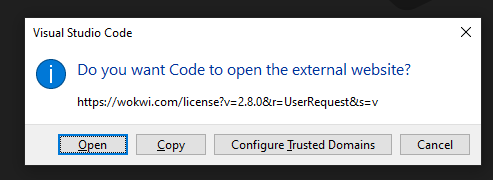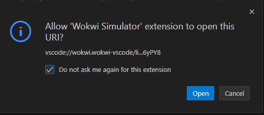 Do not ask me againand click onOpen. Now, your wokwi license is activated in VS Code and will expire after 30 days.