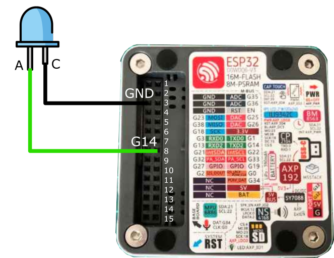 Connect an LED to pin 14 of the M5Core2 and modify this example so that the LED blinks every second instead of every 500 ms.