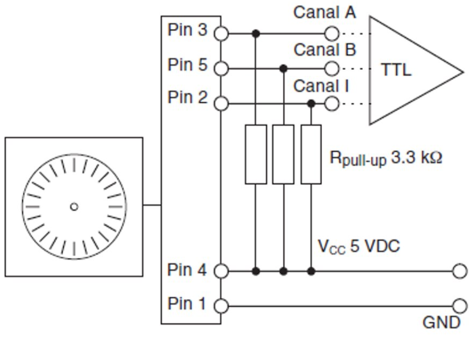 In the lab, the encoder is powered directly from an internal 5 V regulator provided by the equipment electronics. That means it is not necessary to power the encoder externally. However, GND must be considered as the reference for the A and B signals.