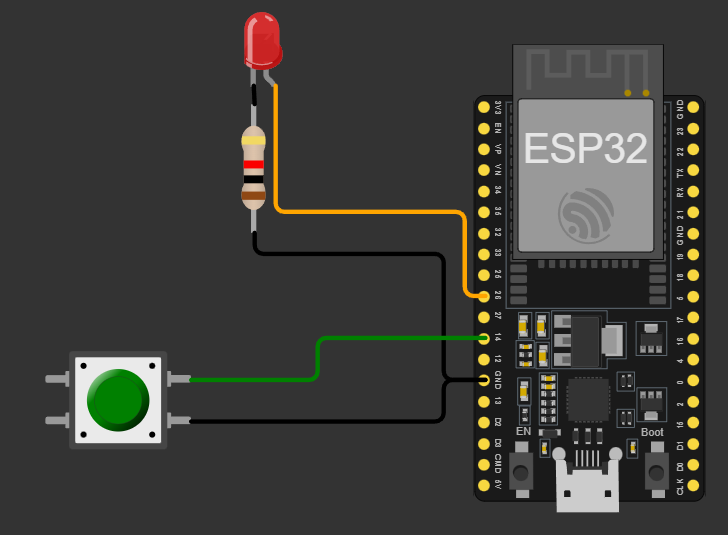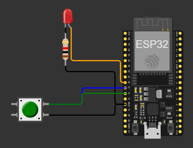 A button and an LED are connected to an ESP32, create a script that does the following: