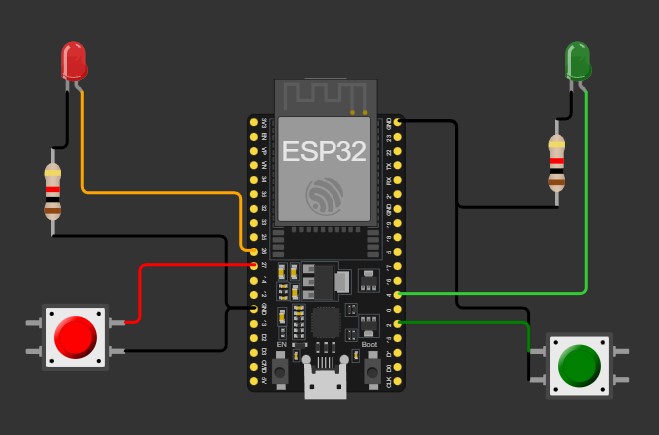 With the same diagram as in exercise 9, when the red button is pressed, the red LED blinks at 3Hz. When the green button is pressed, the green LED blinks at 2Hz. When a button is pressed again, its corresponding LED turns off.